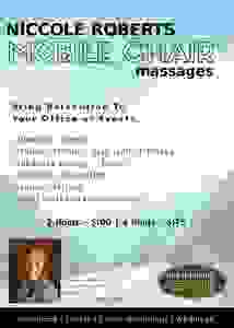 Looking for a way to boost your workplace??? Look no further!!! Let Niccole Roberts bring her mobile chair massage service to YOU!!! For 2 hours you can treat your employees for $100, and 4 hours for $175. Also great for social events, graduations, weddings. Mileage costs added for travel outside Independence.